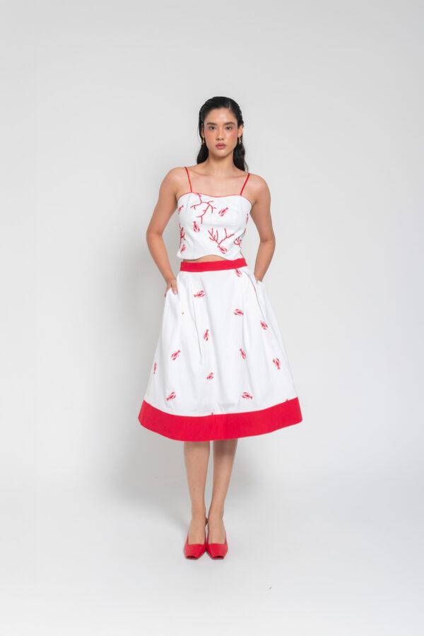 Falda por debajo de la rodilla con vuelo, en nuestro bordado «Langostas», en el ruedo de la falda un pop de color en rojo y cuenta con bolsillos a sus laterales lo que la convierte en una falda versatil y útil.