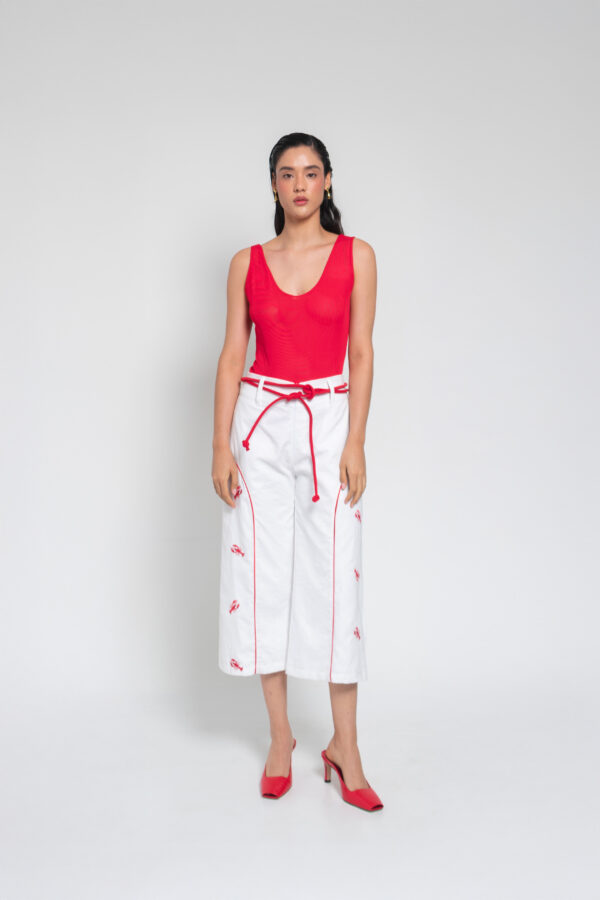Pantalón tipo culotte, con metidos bordados de «Langostas», con cremallera en la parte frontal y cuenta con un cinturón rojo el cual puedes utilizar de diferentes maneras.