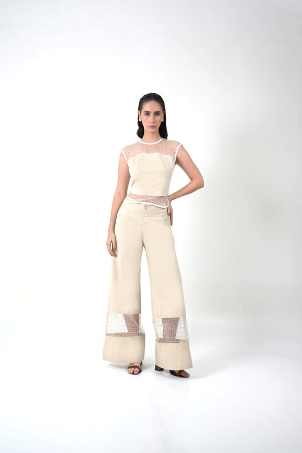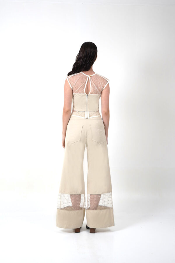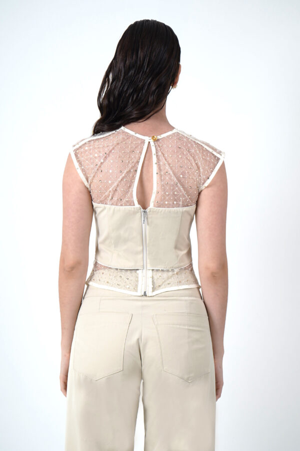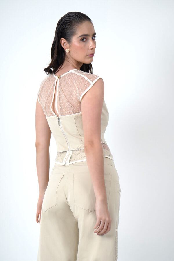 Top con añadidos de malla en la parte superior e inferior. En la parte posterior cuenta con un boton y cierre para una excelente horma a tu cuerpo.
